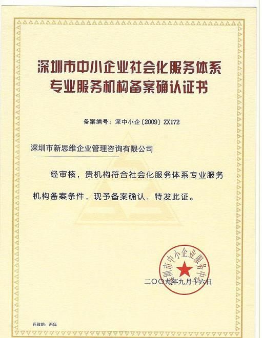 近日,经深圳市中小企业服务中心验证审查,符合相关规定的资质要求,深圳市新思维企业管理咨询有限公司取得了深圳市中小企业社会化服务体系专业服务机构备案认可。